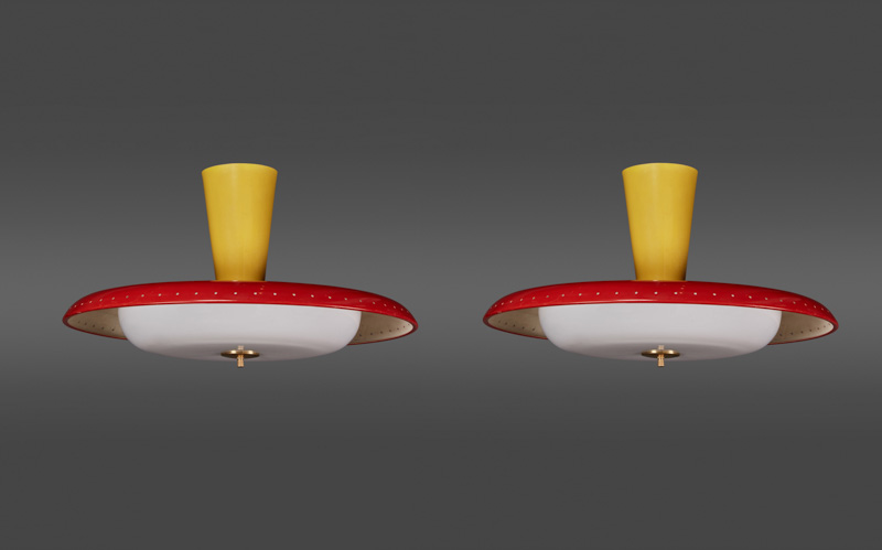 A Pair of Outstanding Red and Yellow Chandeliers with Perforated Metal Shades and White Opaque Glass Diffusers(1963-72)