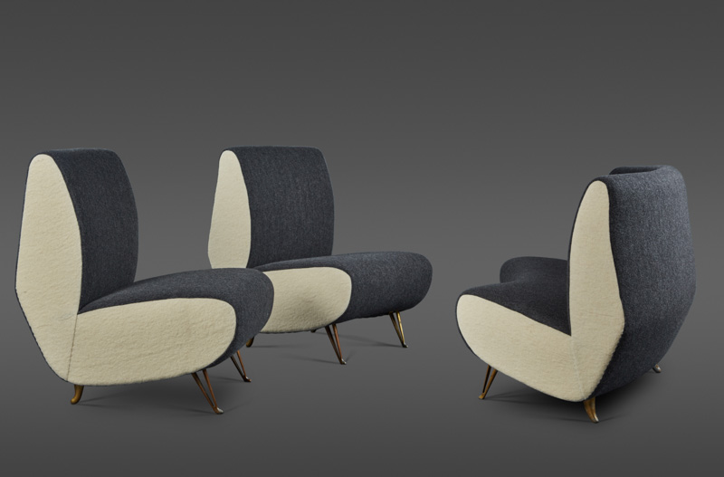A Rare Three Piece Suite of Upholstery in Gray and Crème "Cooked" Wool Fabric, in the Style of Gio Ponti