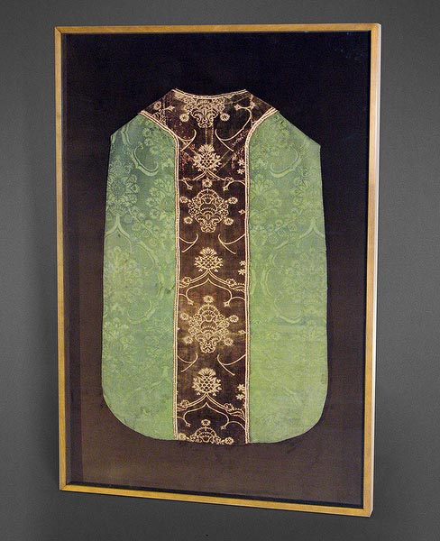 A rare double chasuble decorated with a flower bouquet emerald green damask with a vertical velvet bronze colored stripe with a pomegranate motif.