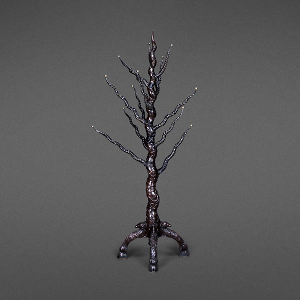 The whimsical twig shaped multi-branched hat stand, with later edition brass balls over ends, above a goat-headed tripartite base ending in hooves.