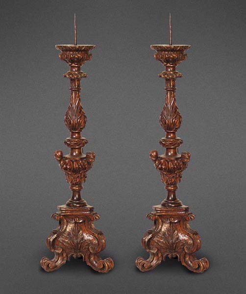 Their scroll-footed bases exhibiting an acanthus foliate motif surmounted by a tripartite group of winged putti amidst a bed of leaves. The balustraded stem supporting an elaborately carved bobeche, the whole retaining a rich, dark patina.