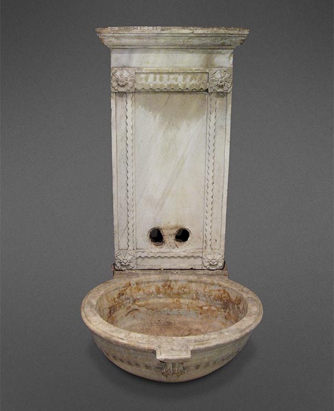 Its fan shaped, gadrooned pediment supported by standing caryatids, above a griffon supported rectangular basin. The field in rose and white veined marble presided over by a bearded human fountain spout, the whole exhibiting graceful and delicate countenance.