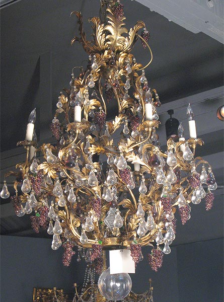 A stunning and dramatic Parisian chandelier. It’s elaborate multi-branch acanthus themed gilt iron armature profusely hung with a bounty of burgandy grape clusters and emerald-colored stylized foliate drops.