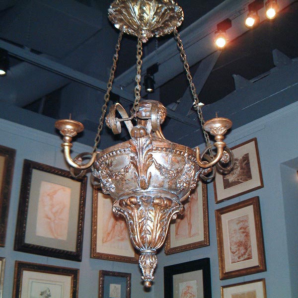 Its body decorated with floral garlands and acanthus motifs and suspended by an intricate floral carved canopy, the whole retaining a beautiful and mellow polychromed patina.