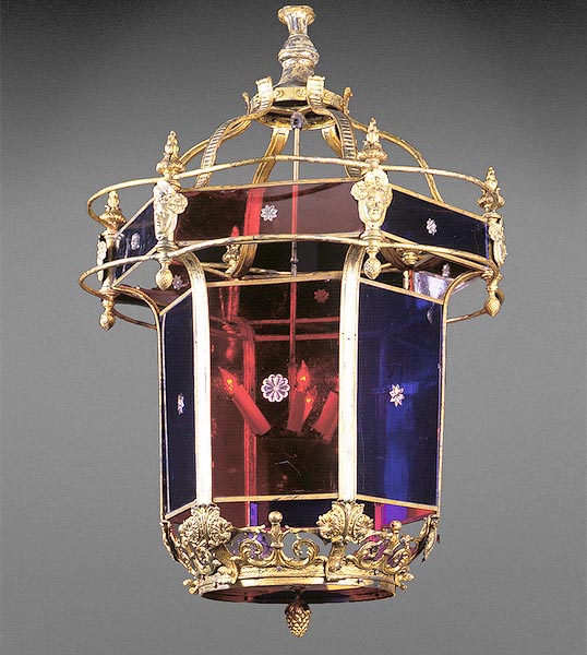 Its hexagonal body delicately framed in profusely decorated gilt iron, featuring cast human faces, pineapple finials and Roccoco style foliate designs, and paneled in alternating sheets of blue and red Venetian glass.