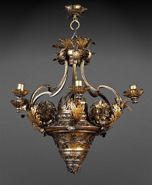 Its inverted conical base, decorated in high relief, issuing six acanthus themed arms, topped with floral bobeches, all surmounted by dual canapies of similar detail. The whole retaining its beautiful gilded and worn patina.
