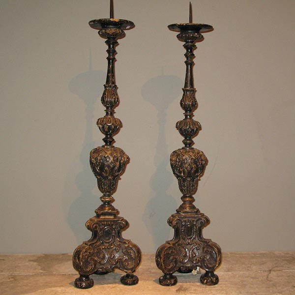 A Beautiful Pair Of 17th Century Italian Intricately Carved Walnut Prickets