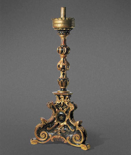 Their shafts a series of bulbous, gadrooned forms below ornamental iron bobeches, all above complex baroque bases exhibiting foliate giltwood carving and volutes on a polychrome ground.