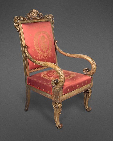 With a molded top-rail carved with stylized anthemions, above a rectangular padded back above a bowed padded seat, the scrolling arms on front supports, on front animal legs and sabre back legs. Published in Antiquariato, August 2001, page 96.
