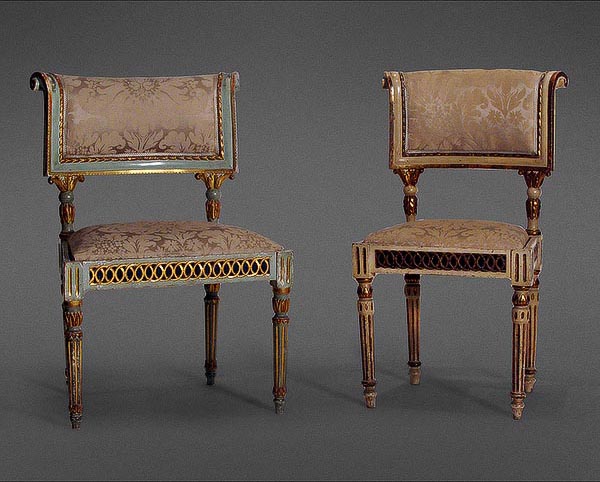 Their scrolled backs terminating in volutes, the seats framed by aprons carved and printed in overlapping gilt crescents, the whole above fluted, tapered legs. Six chairs (Masculine) Six chairs, slightly smaller for ladies.