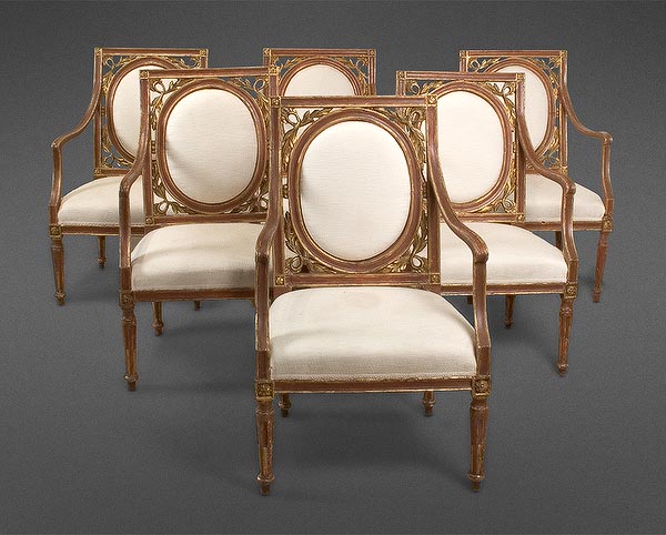 A Dramatic Set of Six Italian Louis XVI Period parcel Gilt and Red-Painted Armchairs