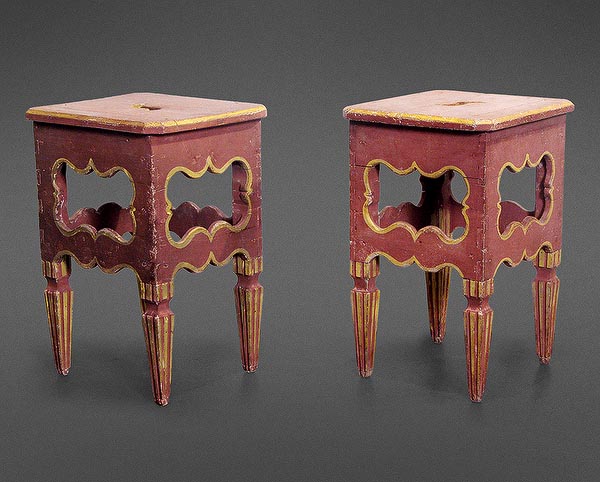 Each square top pierced with S-scrolls outlined in gold over a frieze pierced with Spanish geometric similarly outlined supported by four rectangular tapering legs, painted with gold fluting; red painted background. Louis XVI period, all original.