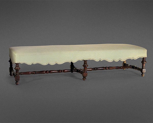 Its turned legs and stretcher supporting a broad plateau, now upholstered and exhibiting a scalloped apron.