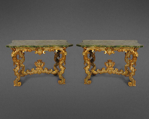 A Rare and Dramatic Carved Pair of Italian 18th Century Parcel Gilt and Painted Console Tables