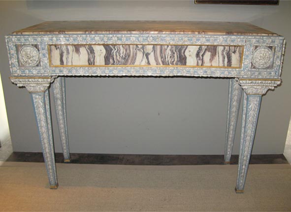 Its cipolin marble and alabaster top above a profusely carved frieze exhibiting floral garlands and rosette motifs combined with panels of alabaster, resting on tapered legs of similar treatment above molded square feet. The whole in excellent condition