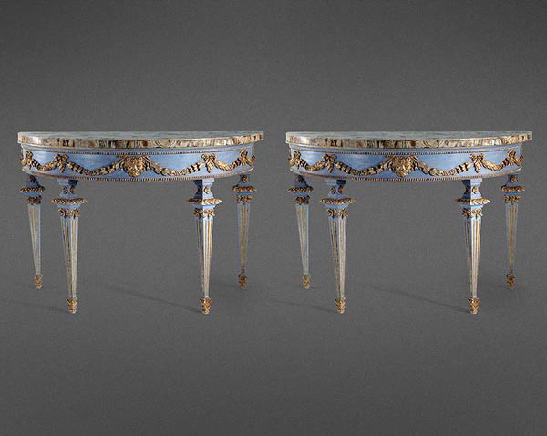 A Dramatic And Imposing Pair of Italian Blue Painted and Parcel Gilt Demi Lune Console Tables