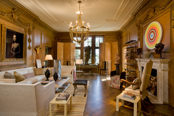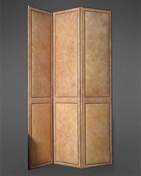 A Custom Three Panel Leather & Nail-Headed Folding Screen Covered in Apricot Bordoni Leather.